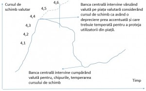 Să luăm cazul băncii noastre centrale, de exemplu, care foloseşte flotarea administrată, deşi pe toate canalele media ni se spune că banca centrală nu ţinteşte cursul de schimb. Din graficul de mai sus reiese următorul lucru: dacă BNR consideră cursul de schimb că are o depreciere prea accelerată (a crescut prea repede de la 4,1 la 4,4 lei / Euro) intervine pe piaţă vânzând valută din rezerva internaţională (consistent mărită cu ajutorul FMI şi securizată prin împrumuturile de siguranţă viitoare). La fel face şi când scade prea brusc cursul dar în acest caz cumpără valută de pe piaţa valutară pentru a o introduce în rezerva internaţională (mai rară această situaţie, cel puţin în ultimii ani).