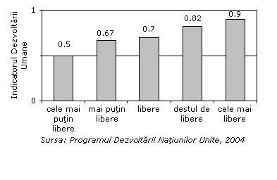 [12] Graficul anterior are la bază metodologia de calcul folosită de Naţiunile Unite. Astfel Indicatorul Dezvoltării Umane este măsurat pe o scară de la 0 la 1 – un indicator mai apropiat de „0” reflectând un nivel redus de dezvoltare, în timp ce apropierea de „1” denotă creşterea nivelului de dezvoltare umană. Se observă uşor corelaţia strânsă existentă între gradul de libertate economică şi IDU. Ţările încadrate în cincimea celor mai puţin libere înregistrează o valoare de 0,5 a Indicelui Dezvoltării Umane, în timp ce ţările considerate a fi cele mai libere se apropie de valoarea maximă a dezvoltării umane.