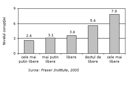 După cum se poate observa, cel mai redus nivel de corupţie se înregistrează în ţările cu un nivel superior al libertăţii economice. De asemenea, se observă o relaţie inversă între libertatea economică şi nivelul de corupţie, ceea ce confirmă ipoteza anterioară, conform căreia intensificarea intervenţiei guvernamentale conduce la creşterea gradului de corupţie.[16]