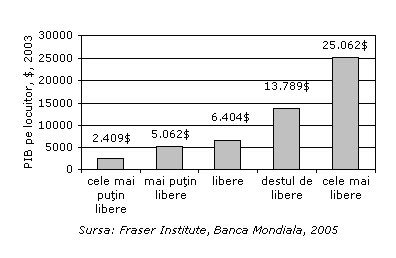 Figura 1 ilustrează relaţia dintre libertatea economică şi venitul pe cap de locuitor[10], ca indicator al bunăstării. Statele incluse în studiu sunt ierarhizate în funcţie de nivelul performanţelor înregistrate în domeniul libertăţii economice şi grupate în cincimi. Se poate observa, în mod evident, relaţia pozitivă între libertatea economică şi nivelul veniturilor. Statele incluse în categoria celor mai libere, au înregistrat un venit mediu pe cap de locuitor de 25.062$, faţă de numai 2.409$ în grupa statelor cu cel mai redus nivel de libertate.