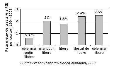 Într-o primă instanţă, vom avea în vedere legătura dintre libertatea economică, venitul pe cap de locuitor şi ritmul de creştere, ca indicatori ai bunăstării şi evoluţiei economice. Informaţiile ilustrează evoluţia ritmului de creştere a venitului mediu pe cap de locuitor în ţările în curs de dezvoltare, cu o rată de 1,5 ori mai înaltă în 1990 faţă de cea înregistrată 1980. Până în 2000, venitul mediu pe cap de locuitor a crescut în statele în curs de dezvoltare cu până la 3,4 ori - o rată de două ori mai mare faţă de cea înregistrată în statele dezvoltate[9].