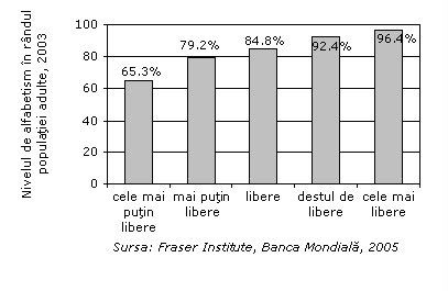 Rata alfabetismului în rândul persoanelor cu vârsta de 15 şi peste 15 ani este semnificativ superioară în statele în care libertatea economică este mai ridicată.