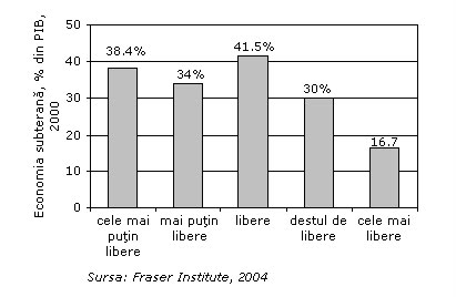 [16] Un efect evident privind gradul excesiv de reglementare şi fiscalizare, coroborat cu perpetuarea practicilor legate de corupţie şi rent-seeking, este intrarea a tot mai multor actori ai mediului de afaceri în zona economiei gri şi subterane. Astfel, dacă vom avea în vedere ponderea estimativă a economiei subterane în PIB, vom putea desprinde concluzia că promovarea libertăţii economice, sub toate dimensiunile sale, reprezintă direcţia sigură pentru diminuarea zonei subterane a economiei (Schneider, 2004).