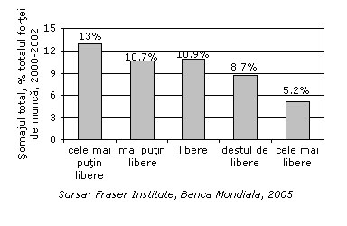 Iată dovezi empirice care vin să confirme postulatele apriorice. Rezultatele analizei întreprinse de Institutul Fraser asupra relaţiei dintre libertatea economică şi rata şomajului sunt ilustrate în figura următoare.