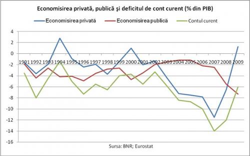 Economisirea unei naţiuni este determinată de economisirea mediului privat (S-I) şi de economisirea statului (adică soldul bugetului, T-G). Astfel, deficitul de cont curent este determinat în mod natural fie de inexistenţa economiilor private, fie de deficitul bugetar, fie de o combinaţie a ambelor elemente. Ce s-a întâmplat cu finanţele României după 1990? Priviţi graficul de mai jos, ţinând minte că soldul contului curent este dat de suma economisirilor private şi publice:
