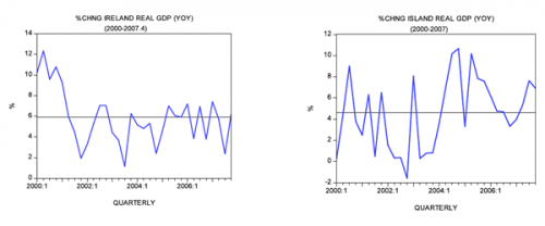 Au existat multe comentarii cu privire la crizele financiare din 2008-2012 în Irlanda şi Islanda. Cele mai multe dintre aceste comentarii s-au limitat la o descriere de evenimente, fără a se referi la cauzele esenţiale ale crizelor. Noi insinuăm faptul că a furniza o descriere detaliată a evenimentelor nu poate fi un substitut pentru analiza economică, ce ar trebui să fie bazată pe cauzele esenţiale care au stat la baza crizei. Cauza esenţială reprezintă forţa primordială care dă naştere la diferite evenimente precum împrumuturile bancare nesăbuite (considerate de mulţi comentatori cauza principală din spatele crizei) şi la o aşa-numită economie supraîncălzită. Acum, în ceea ce priveşte PIB-ul real, atât Irlanda cât şi Islanda au arătat performanţe puternice înaintea izbucnirii crizei din 2008. În perioada 2000-2007, creşterea medie în Irlanda a fost de 5,9% versus 4,6% în Islanda. Deci, ce a declanşat prabuşirea drastică a acestor economii ?