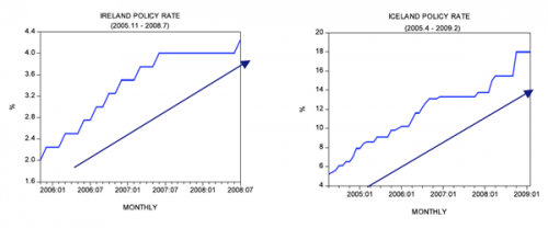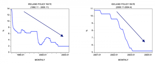 Ceea ce a declanşat expansiunea economică (adică o rată puternică de creştere a PIB-ului real) atât în Irlanda cât şi în Islanda a fost o scădere agresivă a ratei dobânzii de către băncile centrale respective. În Irlanda, rata dobânzii de politică monetară a scăzut de la 13,75% în noiembrie 1992 la 2% în noiembrie 2005. În Islanda, rata dobânzii a scăzut de la 10,8% în noiembrie 2000 la 5,2% în aprilie 2004.