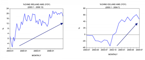 Creşterea masei monetare s-a manifestat vizibil în Irlanda şi Islanda. Rata anuală de creştere a masei monetare măsurate (AMS) a Irlandei a crescut de la -6,7 % în martie 2003 la 22% în martie 2006. În Islanda, rată anuală de creştere a AMS a crescut de la -1,6% în ianuarie 2003 la 61,6% în iunie 2004 , înainte să se stabilească la 47,7% în iulie 2004.