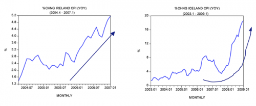 Din cauza majorării puternice a ratei de creştere a masei monetare, o creştere vizibilă a inflaţiei a avut loc în Irlanda şi Islanda. În Irlanda, rata de creştere anuală a indicelui preţurilor de consum (IPC) a crescut de la 2,9% în ianuarie 2006 la 5.1% în martie 2007. În Islanda, rata anuală de creştere a indicelui preţurilor de consum a sărit de la 1, 4% în ianuarie 2003 la 18,6% în ianuarie 2009.