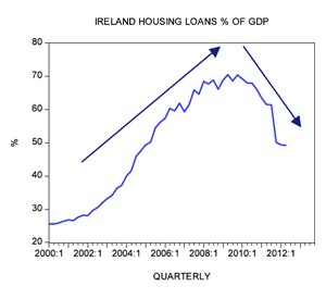 Prin urmare, împrumuturile pentru case ca procent din PIB au scăzut de la 70,5% în trimestrul al doilea din 2009 la 49,2% în trimestrul al doilea al acestui an. În toiul expansiunii economice, o cincime din muncitorii irlandezi se aflau în industria construcţiilor. Preţul mediu al unei case în Irlanda în 1997 era de 102.491 euro. În trimestrul 1 al anului 2007 preţurile s-au stabilizat la 350.242 euro - o creştere de 242%. Preţul mediu al unei locuinţe în Dublin a crescut cu 500% din 1994 până în 2006.
