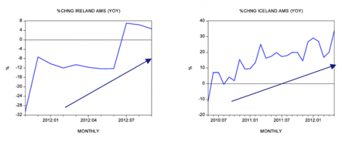 Deocamdată în Islanda , rata anuală de creştere a AMS a sărit de la -11,3% în mai 2010 la 34% în mai 2012. De asemenea, în Irlanda, impulsul de creştere al AMS se arată consolidat, rata anuală de creştere a evoluat de la -30,3 % în noiembrie anul trecut la 4,7% în septembrie 2012.