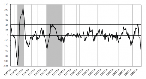 Sursa: US Bureau of Economic Analysis. Componenta federală a cheltuielilor guvernamentale de consum, în miliarde dolari americani (date ajustate sezonier la nivelul anului 2005). Observațiile sunt trimestriale dar exprimate în rate anuale. Cheltuielile guvernamentale sunt scoase din trend folosind filtrul oferit de Robert J. Hodrick și Edward C. Prescott “Postwar U.S. Business Cycles: An Empirical Investigation,” Journal of Money, Credit and Banking 29, no. 2 (Februarie 1997): 1–16. Valoarea parametrului de netezire (smoothing) este stabilită conform studiului lui Morten O. Ravn și Harald Uhling. “On Adjusting the Hodrick-Prescott Filter for the Frequency of Observations,” Review of Economics and Statistics 84, no. 5 (Mai 2002): 371–76. Zonele hașurate corespund războiului coreean și implicării SUA în războiul din Vietnam. Liniile verticale reprezintă datele furnizate de NBER de la începutul recesiunii.