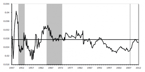 Sursa: U.S. Bureau of Economic Analysis. Componenta federală a cheltuielilor guvernamentale de consum minus cheltuielile cu apărarea națională împărțite la PIB-ul real, în miliarde de dolari(date ajustate sezonier la nivelul anului 2005). Observațiile sunt trimestriale, dar exprimate în rate anuale. Zonele hașurate corespund războiului coreean și implicării SUA în războiul din Vietnam. Liniile verticale reprezintă datele furnizate de NBER de la începutul recesiunii, în trimestrul al patrulea al anului 2007