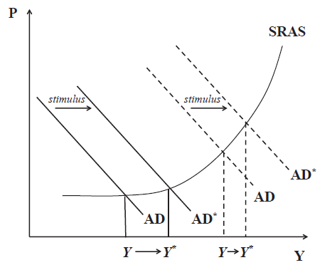 Un alt factor de care depinde eficiența măsurilor de stimulare fiscală este volumul de capacitate nefolosită din economie către care stimulentele sunt orientate. Acest lucru se menționează în expunerea standard de manual a modelului keynesian, în care politica fiscală este concepută ca deplasare a curbei cererii agregate ce se deplasează de-a lungul curbei ofertei agregate pe termen scurt (SRAS) (Figura 3). Curba SRAS reprezintă disponibilitatea firmelor de a produce diverse cantități de bunuri și servicii (Y) la diverse niveluri ale prețului (P). Pe măsură ce economia se apropie de ocuparea deplină a forței de muncă și de nivelul potențial al producției, panta curbei SRAS crește, apropiindu-se de verticală. Asta implică faptul că atunci când economia funcționează la capacitate maximă, creșteri ale cererii agregate se vor transforma, în general, în creșteri ale prețurilor (inflație) mai degrabă decât într-o producție mai mare. În mod similar, porțiunea cu pantă mai mică a SRAS reprezintă niveluri ale producției mult sub nivelul potențial. Există o capacitate nefolosită semnificativă în termeni de capital și forță de muncă disponibilă şi prin încurajarea cererii agregate poate fi dată o utilizare acelor resurse pentru producția de bunuri și servicii.