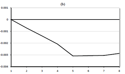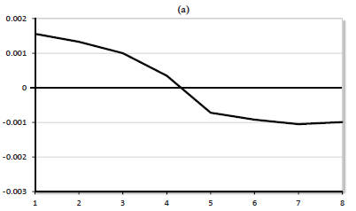 Pentru ilustrare, am estimat o AVS simplă, cu două variabile, pentru PIB-ul real al SUA și cheltuielile guvernamentale federale. Am inclus ambele variabile în ecuații ce conțineau șase lag-uri pentru fiecare din ele. Datele pe care le-am folosit pentru a forma sistemul sunt date trimestriale atât pentru PIB cât și pentru cheltuielile guvernamentale, începând cu trimestrul al treilea al anului 1974 până în trimestrul întâi al anului 2012 și am luat logaritmii naturali ai ambelor serii, după cum este procedura standard în majoritatea studiilor. Figura 4 prezintă reacțiile la impuls ale PIB-ului real al SUA la un șoc al cheltuielilor gvernamentale. O reacție la impuls arată cum un șoc asupra unei variabile afectează, în timp, altă variabilă a sistemului. Reacția la impuls în graficul (a) este obținută presupunând că cheltuielile guvernamentale au loc primele. Cea din graficul (b) este obținută, dimpotrivă, presupunând că PIB-ul real este ordonat primul. Diferența este una ca între noapte și zi. În graficul (a) șocul asupra cheltuielilor guvernamentale are efecte pozitive asupra PIB-ului real pe o perioadă de un an întreg. În graficul (b), efectul unui șoc al cheltuielilor federale asupra PIB-ului este la început zero, și apoi devine negativ după un trimestru.