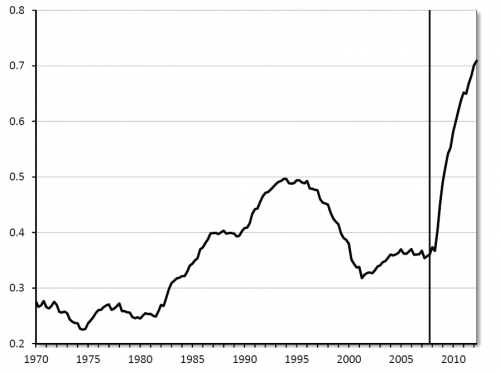 Sursa: Baza de date a Băncii Rezervelor Federale din St. Louis, utilizând datoria publică federală raportată la PIB nominal. Linia verticală corespunde trimestrului 4 al anului 2007, începutul Marii Crize conform datelor NBER privind ciclul de afaceri.