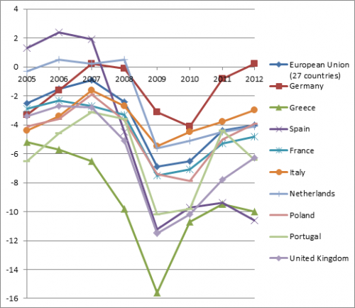 În toate aceste discuții, singurele cifre prezentate ca dovezi ale măsurilor de austeritate care au fost implementate constau în statistici care indică faptul că deficitele au scăzut. Într-adevăr, acest lucru s-a întâmplat, aşa cum o demonstrează cele mai recente date Eurostat (figura 1). Nivelul mediu al deficitelor ca procent din PIB în țările europene la nivelul anului 2012 este mult mai scăzut (4%) decât era în 2009 (6,9%).