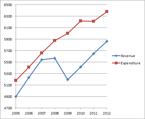 După cum putem vedea, cheltuielile guvernamentale nu s-au oprit niciodată din creștere în Uniune de la începutul crizei financiare, exceptând anul 2011, când au rămas constante. Cheltuielile au crescut cu 6,3% în ultimii 3 ani, cu alte cuvinte, în timpul perioadei când măsurile de “austeritate” ar fi trebuit să se aplice.
