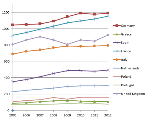 Totuși, există un motiv pentru a ne întreba dacă aceste cifre au fost distorsionate de perioadele de creștere economică negativă care s-au manifestat pe continent. Cheltuielile ar putea să fi scăzut in mărime absolută, însă ar putea fi încă ridicate ca procent din PIB dacă economia s-a contractat şi mai mult. Deci, să analizăm cheltuielile în termeni nominali.