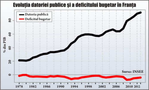 Conform datelor oficiale de la INSEE (Institutul naţional de statistică şi studii economice) între 1978 şi 2013 nu s-a înregistrat niciun excedent bugetar în Franţa, iar cel mai mic deficit a fost de 0,3% din PIB în 1980. Un raport recent al Curţii de Conturi din Franţa arată că este puţin probabilă atingerea ţintei de deficit bugetar din acest an (3,8% din PIB), o valoare realistă fiind de cel puţin 4%, după un deficit de 4,2% din PIB în 2013.
