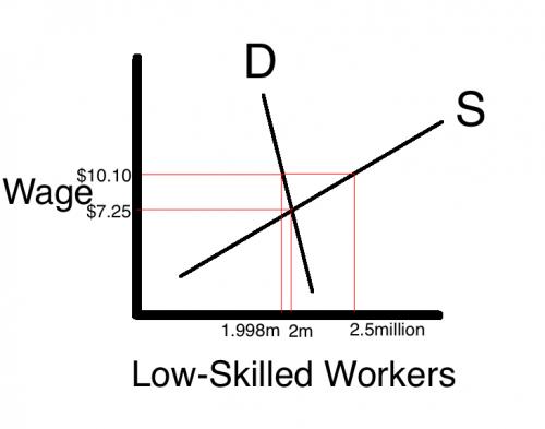 În figura 1 de mai jos, pentru o simplificare schematică presupun că salariul de piață inițial pentru muncitorii slab-calificați este 7,25 $ pe oră. La această rată salarială de 7,25$ două milioane de salariați au locuri de muncă. Apoi, guvernul federal impune un salariu minim de 10,10$ pe oră. Deoarece cererea pentru forța de muncă slab-calificată este (din enunț) foarte inelastică, cantitatea de muncă cerută scade cu doar 2000 salariați, o reducere neglijabilă de 0,1%. Economiștii care efectuează regresii pe această situație ar concluziona - în mod corect - că mărirea salariilor cu 39% are un impact redus asupra nivelului absolut al ocupării forței de muncă.