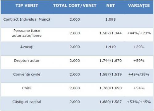 Această schemă ne arată în primul rând cât de incredibil de complicat este sistemul nostru de contribuții sociale. Vedem cum pentru fiecare tip de venit avem o altă sarcină fiscală totală (contribuții sociale obligatorii plus impozit pe venit). Cea mai mare sarcina fiscală este, așa cum evident știam cu toții, pe veniturile din contracte de muncă. Pentru celelalte tipuri de venituri sarcina fiscală este semnificativ mai mică, așa cum reiese și din tabelul de mai jos:
