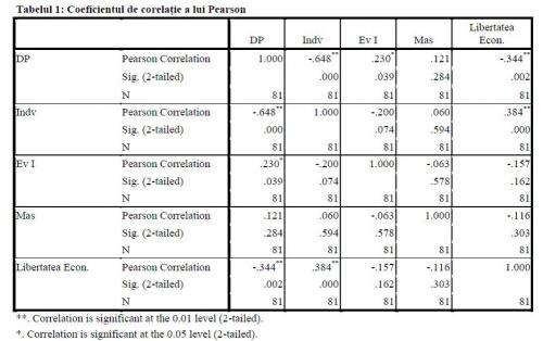 Pentru a determina existența unei legături între dimensiunile culturii naționale și nivelul libertății economice s-a folosit coeficientul de corelație a lui Pearson, notat cu “r”. Acesta masoară natura și intensitatea legăturii dintre două sau mai multe variabile cu valori continue. Coeficientul ia mărimi cuprinse între -1 si +1 . Semnul ” + ” indică o legătură pozitivă, iar semnul ” - ” una negativă. De asemenea, valorile absolute cuprinse între 0 și 0,299 reflectă o relație statistică slabă, cele dintre 0,3 și 0,499 o legătură moderată iar cele de peste 0,5 o relație puternică. Calcularea valorilor statistice s-a realizat utilizând programul de analiză SPSS.