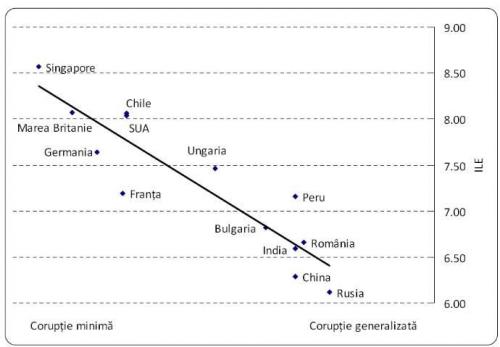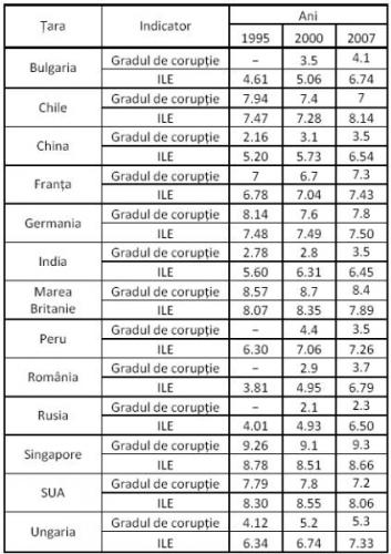 Corelaţia dintre ILE şi gradul de corupţie este evidentă. După cum se observă şi din Tabelul 7, pe masură ce creşte ILE, scade şi nivelul corupţiei. Astfel, dintre ţările analizate, nivelul cel mai ridicat privind percepţia corupţiei este înregistrat de Rusia (fiind îndeaproape urmată de România). În cazul acesteia, gradul de libertate economică este unul dintre cele mai scazute pe anii luaţi în considerare. La extrema cealaltă, Singapore are un nivel ridicat al libertăţii economice şi un nivel scăzut al gradului de corupţie.