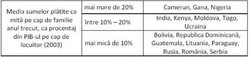 În ţări precum Camerun, Gana şi Nigeria valoarea sumelor plătite ca mită se situează între o cincime şi o treime din venitul pe cap de locuitor. Or, aceste ţări nu se află nici pe departe în categoria ţărilor africane cele mai dezvoltate. În India, Kenya, Moldova, Togo şi Ucraina, familiile plătesc între 10%-20% din venitul pe cap de locuitor drept mită. Conform aceloraşi date familiile din România au plătit, în medie, suma de 56 USD sub formă de mită.