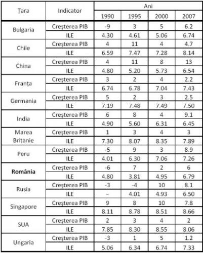 Literatura recentă insistă asupra relaţiei pozitive între libertate economică şi creşterea performanţelor economice. Existenţa aranjamentului instituţional favorabil încurajării activităţilor antreprenoriale de succes, protejarea drepturilor de proprietate, libertatea schimbului, reducerea dimensiunii guvernului apar tot mai frecvent drept ingrediente ale creşterii economice. Evidenţele empirice susţin cele afirmate anterior per ansamblul ţărilor analizate aşa cum se poate observa în Tabelul 1. Evoluţiile cele mai elocvente pot fi constatate în cazul ţărilor foste socialiste precum România, Bulgaria şi Ungaria.