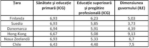 Cele expuse anterior sunt susţinute în cazul ţărilor situate pe primele locuri în clasamentul ICG dar care înregsitrează poziţii modeste în clasamentul ILE, aşa cum poate fi observat în cazul Finlandei, Danemarcei dar mai ales al Suediei (Tabel 4). Explicaţia concordă cu criticile de mai sus privind contradicţile cuprinse în ICG. Scorurile cele mai ridicate în cazul acestor ţări sunt obţinute în domenii în care guvernul păstrează o pondere însemnată. Este vorba despre sănătate publică şi educaţie, domenii în care punctajul obţinut se apropie de maxim, aşa cum se poate observa în Tabelul 5. Această evoluţie a scorurilor pentru cele trei ţări se regăseşte într-o clasificare slabă în ierarhia ILE şi în scorurile modeste la capitolul „Dimensiunea guvernului”. Motivul în constituie ponderile cheltuielilor publice alocate acestor domenii în cele trei ţări, unele dintre cele mai ridicate. Spre exemplu, în Danemarca ponderea cheltuielilor publice cu educaţia era de peste 8% în anul 2005 pe când în Finlanda şi Suedia aceasta era de 6,31%, respectiv 6,97, potrivit datelor Comisiei europene.