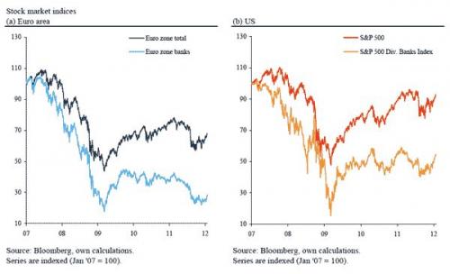 Ultimul val de nelinişte pe pieţele financiare a fost cauzat în special de îngrijorarea crescândă a investitorilor referitoare la “sănătatea economică” a băncilor comerciale, în special a celor din zona euro. Se pare că investitorii îşi pierd tot mai mult încrederea în capacitatea băncilor de a-şi onora obligaţiile de plată în condiţii de piaţă normale şi de a genera profituri suficiente pe viitor. Această interpretare poate oferi o explicaţie pentru cotaţiile scăzute ale acţiunilor emise de băncile din zona euro, a căror valoare s-a diminuatcu aproximativ 71% începând cu 2007[1]. Spre deosebire de aceastea, scăderile acţiunilor emise de băncile americane, au fost de (doar) 50 %.