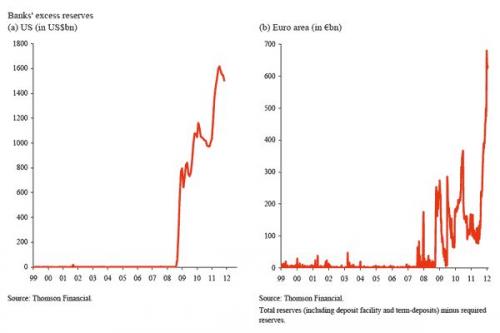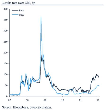 Graficul de mai jos arată diferenţa procentuală dintre dobânda la 3 luni pe piaţa monetara şi indexul swap-urilor „overnight”, în zona euro respectiv în Statele Unite, din 2007 până la începutul lui 2012. Din luna august, anul trecut, diferenţele s-au accentuat semnificativ în special în zona euro, reflectând lipsa de încredere a investitorilor în stabilitatea financiară a băncilor.