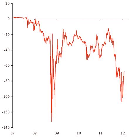 Evoluţia costurilor de finanţare în dolari ale băncilor din zona euro, când apelează la un “basis” swap EUR/USD se pot observa în graficul de mai jos (pentru maturităţi de un an). Cu cât valorile devin negative, cu atât este mai scump pentru băncile din zona euro să obţină finanţare în dolari. De fapt, costurile tind spre nivelul maxim înregistrat în perioada septembrie/octombrie 2008.