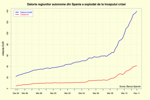 Conform datelor de la Banca Spaniei, datoriile cumulate ale regiunilor semi-autonome au cunoscut o creştere explozivă de la începutul crizei financiare globale şi au ajuns la peste 140 de miliarde de euro la sfârşitul anului trecut (vezi grafic).