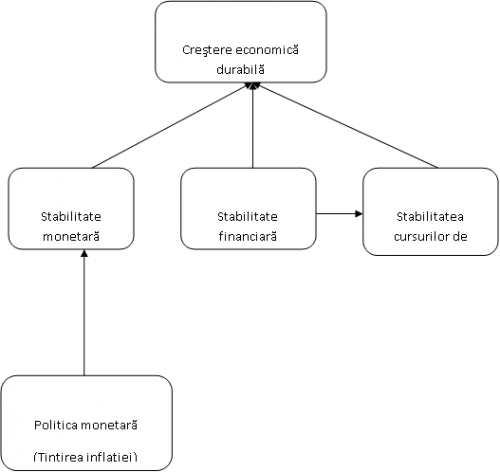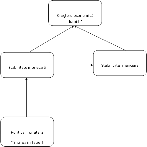 Până la izbucnirea crizei, băncile centrale şi-au bazat strategiile de politică monetară pe ipoteza că stabilitatea monetară duce în mod necesar la stabilitate financiară şi că ambele contribuie la o creştere economică durabilă (figura nr. 6). „Marea moderaţie” a părut să confirme această concepţie. Criza pus însă în cauză viziunea respectivă, arătând, dimpotrivă, că o politică de stabilizare monetară poate să favorizeze apariţia bulelor speculative şi a dezechilibrelor financiare.